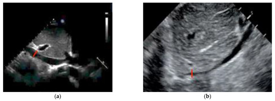 Dilatation of the right ventricle in opposition to a small left ventricle is a typical right heart strain sign that can be seen on an echo and provides clues for the presence of PE. The diagnosis of dilation relies on a comparison between the diameters of the RV and LV at the end of diastole. A normal relationship is defined as 0.6:1 and can be evaluated via an apical four-chamber view, while a ratio of 1:1 is diagnostic of RV dilatation. Nonetheless, the association between RV dilatation and PE can be weak, given the fact that patients with cardiac arrest commonly present RV dilatation, particularly in cases where resuscitation efforts extend in duration [39]. As another sign of right heart strain, the right ventricle can present in a D shape as visualized in a parasternal short-axis view (Figure 7. Less frequently, a clot can be identified as a direct sign of PE [40]. In addition, as mentioned above, some protocols include scanning for deep vein thrombosis as an indicator of pulmonary embolism during arrest [41].