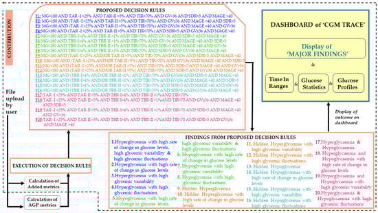 “CGM Trace” was developed by incorporating five standard AGP metrics and five added statistical metrics along with five graphical trends, as illustrated in Figure 1. As the user (doctor and caregiver/patient) uploads a .csv file, the user can view the numeric and graphical representations, from which they can infer the interstitial glucose status. However, the doctor has access to decision rules in the form of “Major Findings”, along with numeric and graphical representations, which are illustrated as time in ranges, glucose statistics, and the glucose profile. The 20 proposed decision rules implied the findings associated with the rules. The findings were: hyperglycemia with the rate of change in glucose levels; high glycemic variability and high glycemic fluctuations; hyperglycemia with a high rate of change in glucose levels; hyperglycemia with high glycemic variability; hyperglycemia with high glycemic fluctuations; hypoglycemia with a high rate of change in glucose levels; high glycemic variability and high glycemic fluctuations; hypoglycemia with a high rate of change in glucose levels; hypoglycemia with high glycemic variability; hypoglycemia with high glycemic fluctuations; hidden hyperglycemia; hidden hyperglycemia with a high rate of change in glucose levels; hidden hyperglycemia with high glycemic variability; hidden hyperglycemia with high glycemic fluctuations; hidden hypoglycemia; hidden hypoglycemia with a high rate of change in glucose levels; hidden hypoglycemia with high glycemic variability; hidden hypoglycemia with high glycemic fluctuations; hyperglycemia and hypoglycemia; hyperglycemia and hypoglycemia with a high rate of change in glucose levels; hyperglycemia and hypoglycemia with high glycemic variability; and hyperglycemia and hypoglycemia with high glycemic fluctuations. The proposed “CGM Trace” is a universal software tool developed by implementing standardized metrics. Irrespective of the origin of the data, meals and physical activity are reflected in the glucose levels, which are thoroughly analyzed using “CGM Trace”.