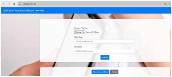 Different combinations of decision rules in identifying hyperglycemia and hypoglycemia were formed based on the literature, as illustrated in Table 2. Decision rules were programmed into the software of “CGM Trace”. The web page was designed using Python Flask, CSS, and JavaScript. The user could upload the CSV file and select a timeframe to view the numerical metrics, as illustrated in Figure 2, and trends metrics, as depicted in Figure S1B–H in Figure S1, Supplementary Material. The doctor could access the findings to view a comprehensive report on glycemic control along with metrics and graphs, as shown in Figure 3. The findings were displayed at the top of the web page, highlighting the summary of the patient’s condition. Time in ranges provided a clear insight into TIR, TAR, and TBR with glucose statistics. A distinct view of glycemic control could be accessed through a graphical representation from “Glucose Profile” to analyze the effect of treatment, changes in medication, physical activity, and meals, which could be easily accessed in case of emergency.