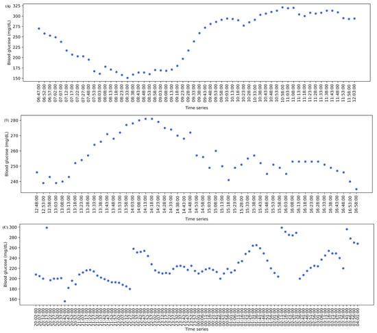 Graphical illustration of glycemic variability in a patient. (A) Intraday glucose trends in the morning. (B) Intraday glucose trends in the afternoon. (C) Intraday glucose trends in the night.
