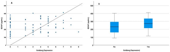 Relationship between salivary BDNF levels and Goldberg depression scale score as continuous variables (A) Each dot refers to the Goldberg score (depression subscale) and BDNF level as dichotomized values (B). All differences between groups (panel B) were significant (p < 0.05).