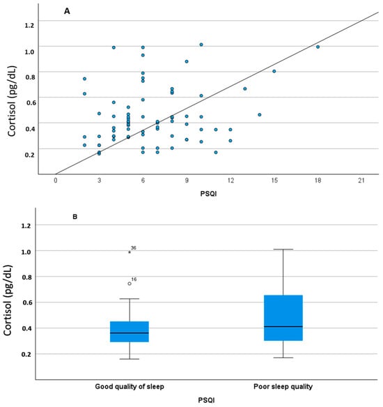Relationship between salivary cortisol levels and Pittsburg Sleep Quality Index score as continuous variable (A) and as dichotomized values (B). All differences between groups (panel B) were significant (p < 0.05).