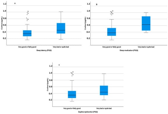 Relationship between salivary cortisol levels and Pittsburg sleep quality subdomains of sleep latency (A), Use of sleeping medication (B) and daytime dysfunction (C). All of the differences between groups in the three panels were significant (p < 0.05.).