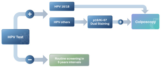We can propose an algorithm (Figure 1) or sequence of tests that incorporates p16/Ki-67 dual staining within a comprehensive cervical cancer screening strategy. This approach could start with primary HPV testing to identify high-risk HPV infections. Positive cases would then proceed to triage using the p16/Ki-67 dual staining test to detect cellular changes indicative of high-grade lesions. Based on the results, individuals could be directed towards appropriate follow-up actions, ranging from closer surveillance to immediate colposcopy. This approach allows for earlier intervention and more personalized patient management strategies, enhancing the overall effectiveness of cervical cancer prevention programs. This strategy optimizes the detection of clinically relevant lesions while minimizing unnecessary interventions, aligning with current evidence on the effectiveness of combined testing methodologies in the era of HPV vaccination.