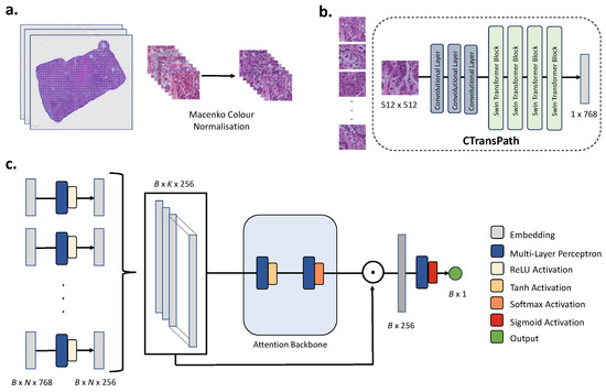 Before passing the patch embeddings to the attention module, a multi-layer perceptron (MLP) with rectified linear unit (ReLU) activation was employed to embed features to output 256-dimensional vectors for each patch k, where , the maximum number of tiles randomly sampled per sample at each epoch, was set to 512. The resulting feature vectors were then passed to an attention module to determine the attention score for each tile using Equation (1), where , , . The attention module consisted of a fully connected linear layer and a tanh activation function, followed by a second fully connected linear layer and softmax activation, resulting in an attention score vector.