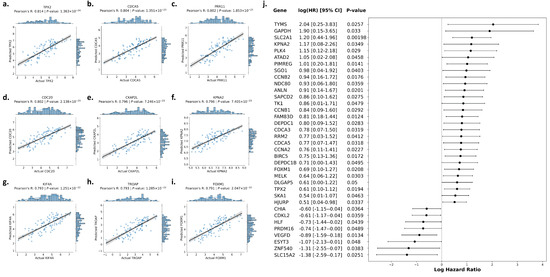 External validation on CPTAC-LUAD dataset. Correlation plots for the top 9 genes as ranked by Pearson’s R are shown. (a) TPX2. (b) CDCA5. (c) PRR11. (d) CDC20. (e) CKAP2L. (f) KPNA2. (g) KIF4A. (h) TROAP. (i) FOXM1. (j) Forest plot of the 36 genes that had predicted expression from WSIs in the CPTAC-LUAD dataset that was found to be prognostic of OS.
