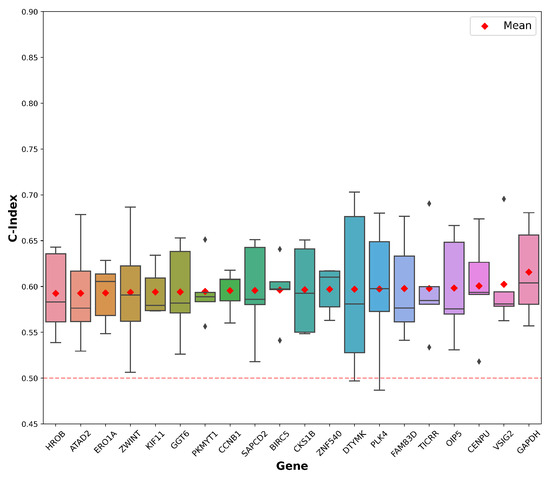 Prognostic relevance of predicted gene expression in TCGA-LUAD using cross-validated C-index. Box plots of cross-validated C-index for the top 20 genes are shown. Red diamonds represent the mean C-index across folds.