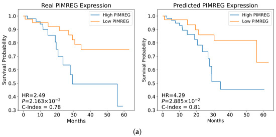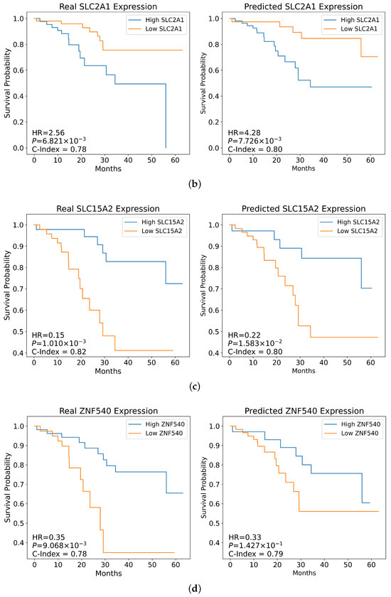 Kaplan–Meier survival analysis further validated the patient stratification based on both real and predicted gene expression. Figure 4 shows Kaplan–Meier plots for the top two genes where upregulation was associated with a survival benefit and the top two genes where downregulation correlated with improved survival, as ranked by HR (corresponding plots for all 36 genes can be found in Supplementary File S3). C-indices, log-rank p-values, and HRs of risk group from adjusted Cox regression for both real and predicted expression are shown for each of the four genes. Predicted overexpression of PIMREG (Figure 4a) and SLC2A1 (Figure 4b) was found to be associated with poorer OS, as evidenced by the HRs of 4.29 and 4.28, respectively. Meanwhile, predicted underexpression of SLC15A2 (Figure 4c) and ZNF540 (Figure 4d) were found to be associated with poorer OS.
