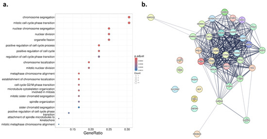 GO enrichment analysis of the 36 genes that had prognostic predicted expression in CPTAC-LUAD revealed a high number of biological processes involved in cell cycle regulation. The processes with the highest gene ratios included “chromosome segregation” (Gene Ratio = 0.306; adj. p = ), “mitotic cell cycle phase transition” (Gene Ratio = 0.306; adj. p = ), “nuclear chromosome segregation” (Gene Ratio = 0.250; adj. p = ), “chromosome localization” (Gene Ratio = 0.167; adj. p = ), and positive regulation of cell cycle process (Gene Ratio = 0.222; adj. p = ). The top 20 enriched biological processes are shown in Figure 5a. Figure 5b shows the PPI network of the 36 genes that had predicted expression in the external dataset that was prognostic of OS. The cluster of highly connected nodes represents genes that were upregulated in patients with poor survival, while the eight genes that were downregulated in patients with poor survival have nodes with few connections to other nodes.