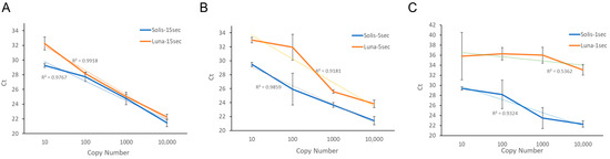 Graphical representation of Ct values of Luna vs. Solis. Ct values are averaged and plotted for each copy number concentration for 15 s (A), 5 s (B), and 1 s (C) A/E times. For each A/E time, the Solis PCR assay maintains a strong linear curve with an R2 above 90%.