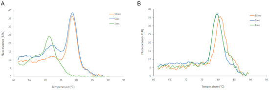 Melting profile of primer-dimers and intended target. Illustrated are Tms curves for Luna (A) and Solis (B) PCR assays amplifying 10,000 target copies at 15, 5, and 1 s A/E times. With Luna enzyme, at the 5 s A/E time, primer-dimers are seen at 72 °C along with the target amplification at 78 °C. However, for the Solis PCR assay, only the intended target amplicon Tm curves are visualized at all A/E times.