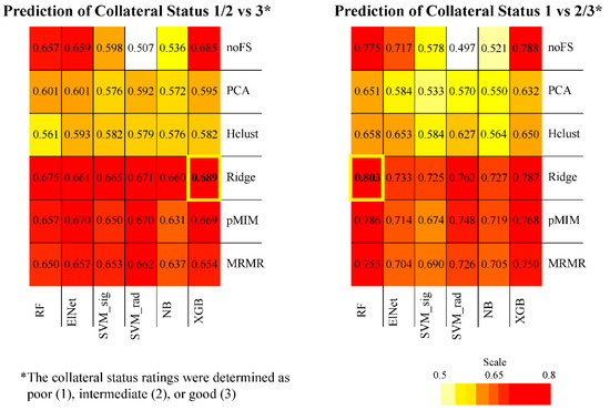 A heatmap summary of the performance of all collateral status candidate models in cross-validation is provided in Figure 1. The highest averaged AUC was 0.69 ± 0.05 for good vs. poor or intermediate collateral status prediction by combination of Ridge feature selection and random forest machine learning, and was 0.80 ± 0.05 for poor vs. intermediate or good collateral status prediction by combination of Ridge feature selection and XG-boost machine learning.
