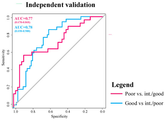 In the independent testing cohort, the Ridge and XG-boost combination achieved an AUC of 0.77 (0.67–0.87) for the prediction of poor vs. intermediate or good flow and an AUC of 0.78 (0.70–0.90) for good vs. poor or intermediate flow (Figure 2). Of note, the Ridge and random forest combination model had an AUC of 0.68 (0.57–0.79) for good vs. poor or intermediate flow, which was lower than the runner-up combination of Ridge and XG-boost in the cross-validation platform (Figure 1). On the independent test set, we also evaluated the accuracy of the three-tiered model predictions versus consensus scores (poor vs. intermediate vs. good) using multi-class ROC analysis, with a resulting multi-class AUC of 0.635 (notable, no 95% CI or p value is appropriate for this analysis).