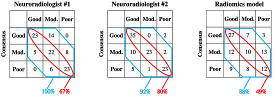 One of the main challenges in training machine learning models for the prediction of collateral status is the subjective nature of the scoring system. In other words, the ground truth used for training and testing of the models is prone to interrater variability. Even after a one-hour dedicated training session with collateral score examples, the interclass correlation coefficient between 29 radiologists and radiology residents reached 0.75, using the Tan scale for collateral status [39,40]. We utilized the Miteff scale, as it has been a reliable scoring system for predicting both favorable and unfavorable outcome, rather than unfavorable outcome alone [16]. Nevertheless, the significant association of radiomics-generated collateral scores with 3-month mRS outcome in the independent test cohort (Table 1) is strong evidence for the clinical relevance of model prediction despite lower concordance with consensus scores compared to neuroradiologists (Figure 3).