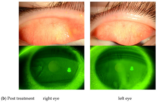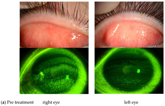 (a) Representative case of non-phlyctenular-type meibomitis-related keratoconjunctivitis (non-PL-MRKC) prior to treatment. The diagnosis of meibomitis is made by the hyperemia of the lid margin and palpebral conjunctiva, and by the obstructive meibomian gland function. Fluorescein staining shows granular and slightly larger epithelial lesions than superficial punctate keratopathy (SPK), and the abnormal staining coexisted with small dark spots. (b) Representative case of non-PL-MRKC post treatment. Oral clarithromycin at a dose of 200 mg/day and 0.5% erythromycin-based eye drops (4 times daily) were administered. After 3 months of treatment, improvement of hyperemia of the lid margin and tarsal conjunctiva was observed, suggesting improvement of the meibomitis.