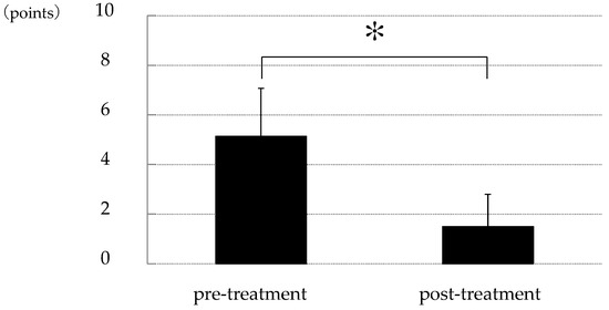 Changes in corneal epithelial damage score between that at pre and post treatment. Compared to that at before treatment, corneal epithelial damage similar to SPK was significantly improved after treatment with oral clarithromycin (p < 0.0001) [study of 22 cases; pre-treatment: 5.1 ± 1.9 points; post-treatment: 1.5 ± 1.3 points; based on the National Eye Institute score (a 15-point scale)]. Asterisk indicates a significant difference (p < 0.05).