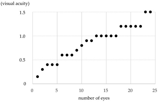 The distribution of pre-treatment corrected visual acuity in non-PL-MRKC eyes. The distribution comprised 0.1–0.5 in 5 eyes, 0.6–0.9 in 7 eyes, and 1.0 or higher in 12 eyes. In 12 of the 24 non-PL-MRKC eyes, the mean corrected visual acuity had decreased to less than 1.0 at prior to treatment.