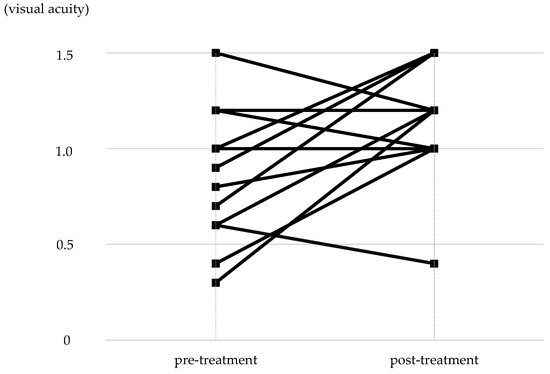 The distribution of pre-treatment corrected visual acuity in the non-PL-MRKC eyes is shown in Figure 5. The visual acuity distribution comprised 0.1–0.5 in five eyes, 0.6–0.9 in seven eyes, and 1.0 or higher in twelve eyes. In 12 of the 24 non-PL-MRKC eyes, the mean corrected visual acuity had decreased to less than 1.0 (20/20) prior to treatment. In the 17 non-PL-MRKC eyes, in which a comparison of the corrected visual acuity before and after treatment was possible, mean visual acuity had significantly improved after treatment (i.e., pre treatment: 0.8 ± 0.3; post treatment: 1.1 ± 0.3) (p = 0.0157) (Figure 6).