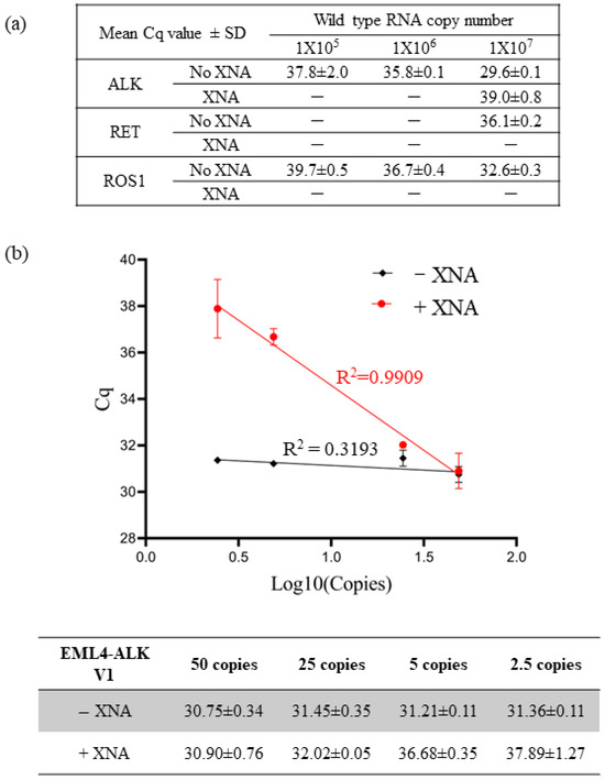 First, to evaluate the impact of XNA on specificity, we tested the detection efficiency of each QfusionTM assay by using 10-fold serial dilutions of ALK, RET, or ROS1 wild-type RNA transcripts in the presence or absence of XNA. As shown in Figure 1a, each assay exhibited non-specific detection of wild-type RNA transcripts. However, the presence of XNA efficiently reduced the detection of wild-type RNAs. This suggests that XNA enhances the assay’s specificity, reducing the occurrence of false positives.