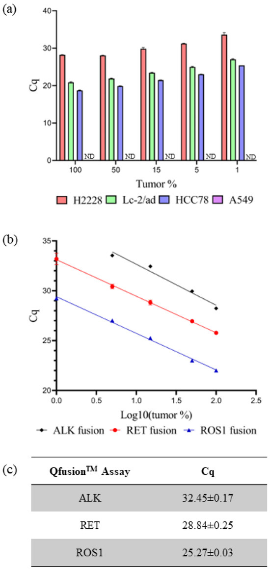 Evaluating QfusionTM assay performance. (a) Each QfusionTM assay was tested with the corresponding cell lines: A549, H2228 (EML4-ALK), LC-2/ad (CCDC6-RET), and HCC78 (SLC45A-ROS1). The A549 was a fusion-negative cell line and Cq was not determined (ND). (b,c) FFPE RNA reference standard was diluted with normal FFPE RNA and analyzed with each QfusionTM assay. The x-axis represents the logarithm base 10 value of tumor percentage. Cq values were determined for 15% of tumor samples.