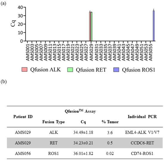 The current gold standard diagnostic method for detecting ALK, RET, or ROS1 fusion is FISH. A positive fusion result is typically determined if at least 15% of tumor cells exhibit rearrangement [39]. The QfusionTM assay is specifically designed to detect fusions in both archived and fresh tissue samples. The Cq values for each QfusionTM assay at the 15% tumor cell threshold were determined. To ascertain these Cq values, RNAs were prepared from commercially available FFPE reference standards and normal lung FFPE samples. The QfusionTM assay was then used to analyze various concentrations of reference-standard FFPE RNAs that were diluted with normal lung FFPE RNAs. The resulting Cq values for the QfusionTM ALK, RET, or ROS1 fusion assays at a 15% tumor fraction were determined as 32.45 ± 0.17, 28.84 ± 0.25, and 25.27 ± 0.03, respectively (Figure 2b,c).