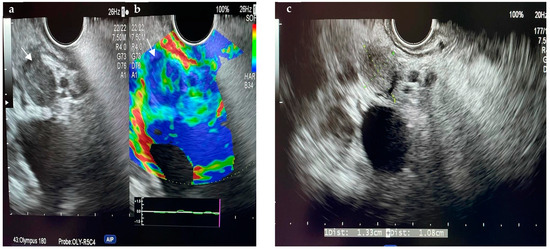 EUS imaging of a distal CCA, a lesion measuring 1.33 cm/1.08 cm marked by the white arrow (a,c), EUS+elastography showing a blue colored signal in the area of the lesion marked by the white arrow (b).