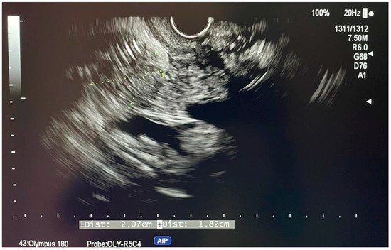 EUS imaging of a distal CCA, a lesion measuring 2.07 cm/1.82 cm and the dilated common bile duct.