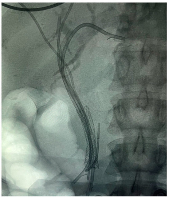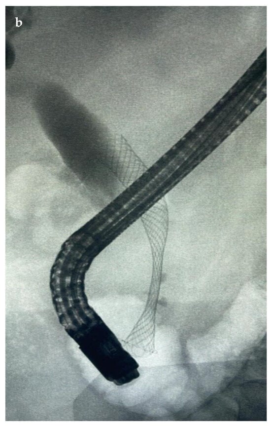 (a) Perihilar CCA, Bismuth–Corlette type IV stricture with uncovered SEMS invaded by the tumor; (b) 7 Fr/12 cm plastic stent placed inside the SEMS.