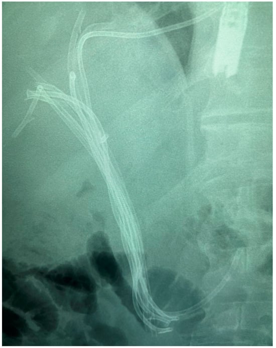 Perihilar CCA, Bismuth-Corlette type IV stricture with multiple plastic stents.