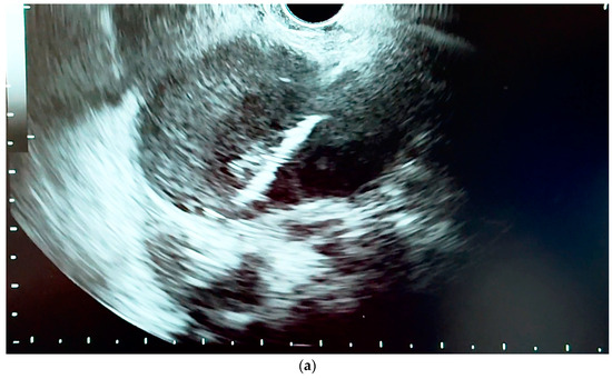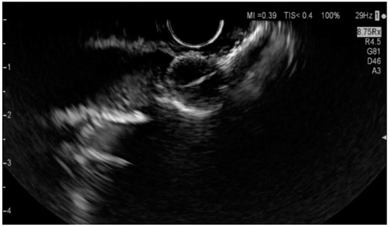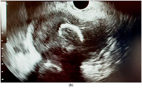 Figure 1 and Figure 2 show two cases of EUS imaging of distal CCAs. Moreover, Figure 1b shows an elastography image with a blue-colored signal in the area of the lesion, suggesting the presence of hard tissue.