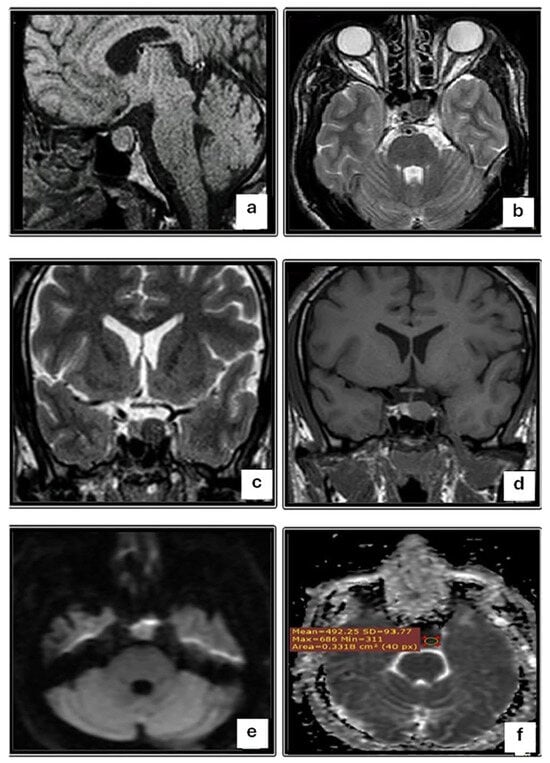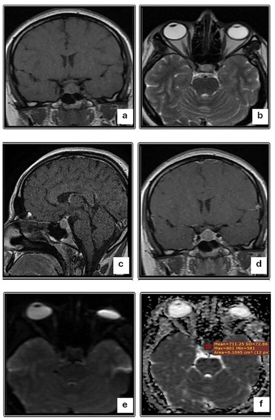 A 50-year-old male patient complains of a persistent headache, progressive enlargement of his hands and feet, and changes in facial features. (a) Sagittal T1-weighted image shows a small, well-defined, expanding, hyperintense sellar lesion. No supra or parasellar extensions were observed. (b) Axial and (c) Coronal T2-weighted images show a hypointense signal of the sellar lesion. (d) Coronal contrast-enhanced T1-weighted image shows the homogeneous enhancement of the lesion. (e) Axial DWI sequence (b = 1000) shows a hyperintense signal of the sellar lesion. (f) Axial ADC map shows a hypointense signal of the sellar lesion with a mean ADC value of 0.49 × 10−3 mm2/s. The MRI findings are consistent with pituitary macroadenoma. Surgery and histopathology were performed, and a macroadenoma with a soft consistency was confirmed.
