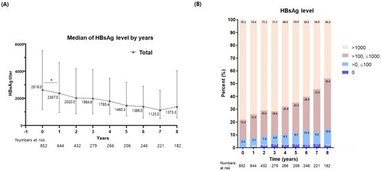 Serial changes in (A) the HBsAg levels and (B) their proportion of groups after nucleos(t)ide analogue therapy. *, p < 0.05.