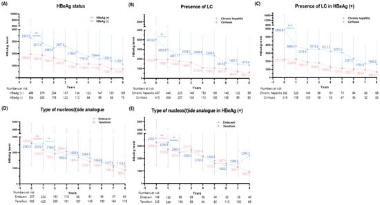 Serial changes in the HBsAg levels according to (A) HBeAg status, (B) the presence of liver cirrhosis in entire population, (C) HbeAg—positive patients, and the type of nucleos(t)ide analogue therapy in (D) the entire population and (E) HBeAg—positive patients. *, p < 0.05; **, p < 0.01; ***, p < 0.001.