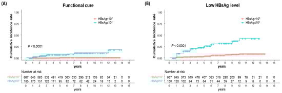 Kaplan–Meier curve for (A) functional cure and (B) low HBsAg level according to baseline HBsAg level.