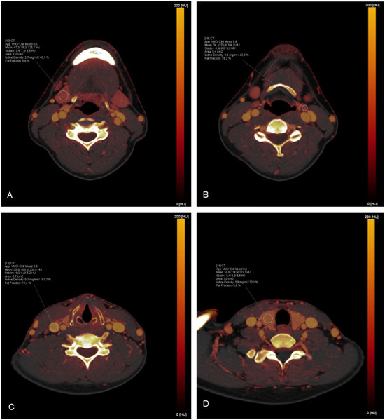 Exemplary demonstration of ROI measurements on iodine maps: (A) The right submandibular gland; (B) A lymph node in cervical level II on the left side; (C) The right jugular vein; (D) The right lobe of the thyroid gland.