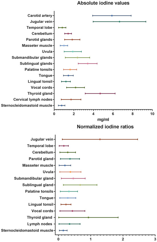 Absolute iodine values and normalized iodine ratios for the different organs and tissues of the head and neck.