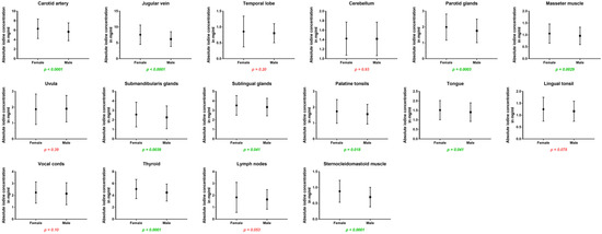Regarding iodine ratios, women and men differed in the values for the jugular vein (higher values for women), cerebellum (higher values for men), uvula (higher values for male patients), and sublingual glands (higher ratio for men) (p < 0.05).