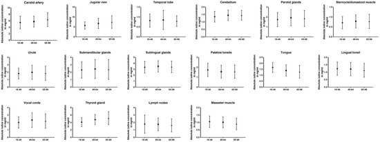 Comparing all three age groups, the greatest differences in absolute values were observed between the youngest and oldest groups. For the carotid artery (5.48 ± 2.0 vs. 6.39 ± 2.1 mg/mL, p < 0.001), jugular vein (5.75 ± 1.8 vs. 7.48 ± 3.2 mg/mL, p < 0.001), the cerebellum (1.36 ± 0.4 vs. 1.45 ± 0.3 mg/mL, p = 0.02), and thyroid gland (4.10 ± 1.2 vs. 5.18 ± 1.7 mg/mL, p < 0.001) older patient showed higher values than the young group, while being lower for the masseter muscle (1.06 ± 0.4 vs. 0.91 ± 0.4 mg/mL, p < 0.001), palatine tonsils (1.74 ± 0.7 vs. 1.57 ± 0.6 mg/mL, p = 0.03), and lingual tonsil (1.24 ± 0.4 vs. 1.13 ± 0.5 mg/mL, p = 0.02). Fewer significant differences can be reported between the young and middle-aged groups (carotid artery, jugular vein, cerebellum, palatine tonsils, vocal cords, and thyroid gland) (p ≤ 0.03). The closest groups were the middle-aged and old age groups, with the only changes occurring in iodine uptake for the masseter muscle (p = 0.009), thyroid gland (p = 0.01), and the cervical vesicles (p ≤ 0.02). However, when normalized iodine ratios were analyzed, the oldest group showed the most frequently significant differences and lowest iodine ratios compared to the other age groups (p ≤ 0.03). A detailed demonstration of all data can be found in Table 4 and Figure 5.