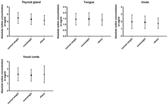 Absolute iodine concentrations in patients with a normal BMI were higher for the jugular vein (p < 0.001), parotid glands (p < 0.001), sublingual glands (p ≤ 0.02), and the sternocleidomastoid muscle (p < 0.001) when compared to the overweight and obese group. Additionally, the obese group had lower values for palatine tonsils, lingual tonsils, and the thyroid when compared to the group with a BMI lower than 25 (p ≤ 0.02). Comparing overweight patients and obese patients, the parotid gland and the lingual tonsils showed a decline with a higher BMI (p < 0.004).