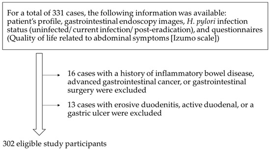 - Kinoshita, Y.; Chiba, T. Characteristics of Japanese patients with chronic gastritis and comparison with functional dyspepsia defined by ROME III criteria: Based on the large-scale survey, FUTURE study. Intern. Med. 2011, 50, 2269–2276. [Google Scholar] [CrossRef]