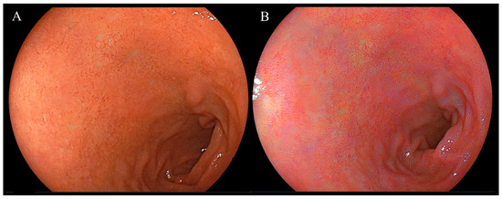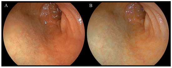 Representative endoscopic images of the duodenal mucosa of bulbs not showing red mucosa using white light imaging and linked color imaging. (A) White light imaging (WLI). Duodenal mucosa of bulbs. (B) Linked color imaging (LCI). The duodenal mucosa of bulbs was not visible in a red color using LCI.