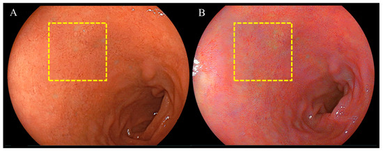 Representative endoscopic images using (A) white light imaging or (B) linked color imaging in the duodenal mucosa of bulbs. Dashed yellow lines demarcate regions of interest (ROIs; 400 × 400 pixels). The ROIs in the anterior wall of the duodenal bulb were localized in the same positions for each specific lesion.