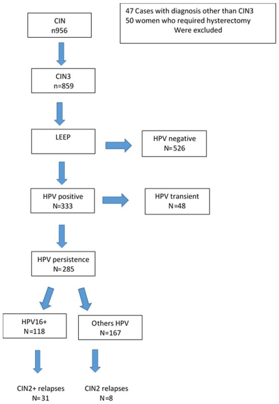 Women who underwent LEEP for histology other than CIN3, who had no follow-up data, who had a history of cervical cancer or history of HIV or other conditions affecting the immune response were excluded.