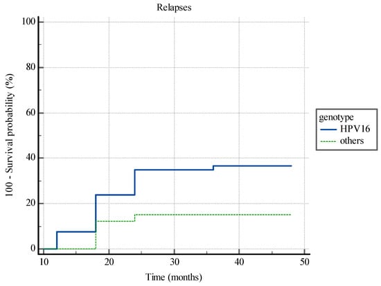 Kaplan-Meier analysis was used to identify a possible statistically significant difference between the time to onset of recurrence in patients with HPV 16 infection and in patients with other hrHPV genotypes.