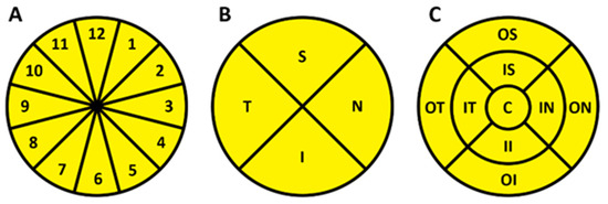 The Early Treatment of Diabetic Retinopathy Study (EDTRS) grid for optic nerve head (A,B) and macular (C) evaluation. (A)—twelve clock-hour ONH sector distribution; (B)—ONH quadrants: superior (S), nasal (N), inferior (I), temporal (T); (C)—macular sectors: center or fovea (C), inner and outer superior (IS; OS), inner and outer nasal (IN; ON), inner and outer inferior (II; OI), inner and outer temporal (IT; OT).