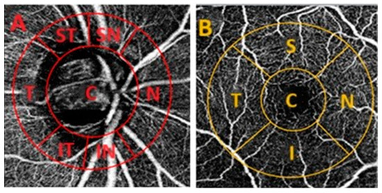 VD values were evaluated in the ONH and macula using 3 × 3 mm OCT-A scans (DRI-OCT Triton, Topcon, Tokyo, Japan). The OCT-A images were centered on the disc and fovea, allowing the alignment and superimposition with the infrared fundus image yielded by SS-OCT using the ImageJ software (Version 1.53k, National Institutes of Health, Bethesda, ML, USA). The VD was calculated using the ImageJ software and defined as the percentage (%) area occupied by capillaries. Four different layers of the retina and choroid were assessed, including superficial capillary plexus (SCP), deep capillary plexus (DCP), avascular retinal zone, and choriocapillaris layer. The Garway–Heath grid was used to evaluate VD in the ONH, composed of the center (C) and six sectors around the ONH: superior temporal and nasal (ST; SN), N, inferior nasal and temporal (IN; IT), and T (Figure 2A). In the macula, a grid of five sectors was applied, which included the C, S, N, I, and T quadrants (Figure 2B). Each parameter was measured three times in each grid region and the mean value was used to ensure accuracy.