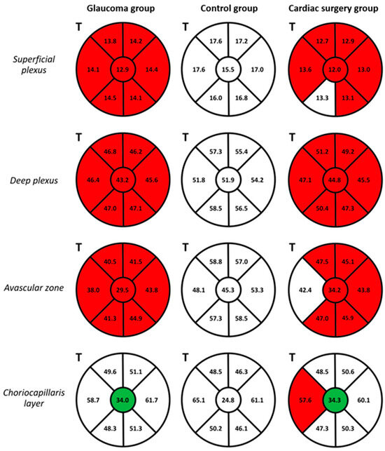 Vessel density (VD) in the optic nerve head assessed by optical coherence tomography angiography. The VD mean values are shown for each sector (temporal side (T) on the left) for the open-angle glaucoma (OAG, left), control (center), and cardiac surgery (CS, right) groups. The color of the sectors indicates the differences between the group (OAG or CS) compared to the control group. Green color: VD in the corresponding sector is significantly higher than the control group; red color: VD in the corresponding sector is significantly lower compared to the control group; white color: VD in the corresponding sector does not differ significantly compared to the control group. The differences were considered statistically significant with a p-value of <0.05.