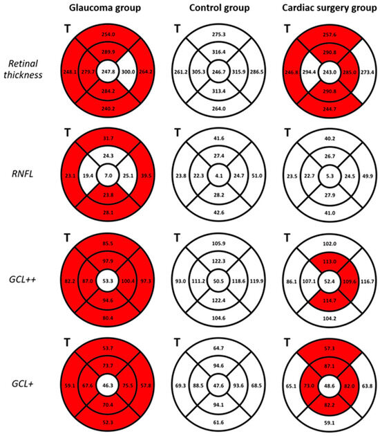 Thicknesses of the retinal layers in the macular region assessed by optical coherence tomography. The thickness mean values of the retinal layers are shown for each sector (temporal side (T) on the left) for open-angle glaucoma (OAG, left), control (center), and cardiac surgery (CS, right) groups. The color of the sectors indicates the difference between the group (OAG or CS) compared to the control group. Red color: thickness of the retinal layer in the corresponding sector is significantly lower compared to the control group; white color: thickness of the retinal layer in the corresponding sector does not differ significantly compared to the control group. The differences were considered statistically significant with a p-value of <0.05. GCL: ganglion cell layer; GCL+: ganglion cell layer+ (GCL + inner plexiform layer); GCL++: ganglion cell layer++ (RNFL + GCL + inner plexiform layer); RNFL: retinal nerve fiber layer.