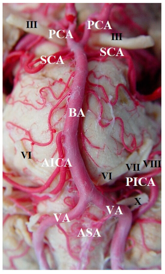 - Kwiatkowska, M.; Rzepliński, R.; Ciszek, B. Anatomy of the pontine arteries and perforators of the basilar artery in humans. J. Anat. 2023, 243, 997–1006. [Google Scholar] [CrossRef] [PubMed]