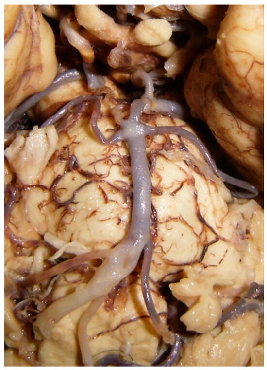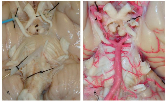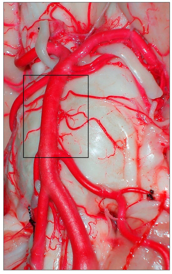- Smith, K.; Ventre, G.J.; Palmisciano, P.; Hussein, A.E.; Hoz, S.S.; Forbes, J.A.; Lowrie, D.J.; Zuccarello, M.; Andaluz, N.; Prestigiacomo, C.J. Brain Vasculature Color-Labeling Using the Triple-Injection Method in Cadaveric Heads: A Technical Note for Improved Teaching and Research in Neurovascular Anatomy. Oper. Neurosurg. 2023, 24, 291–300. [Google Scholar] [CrossRef]